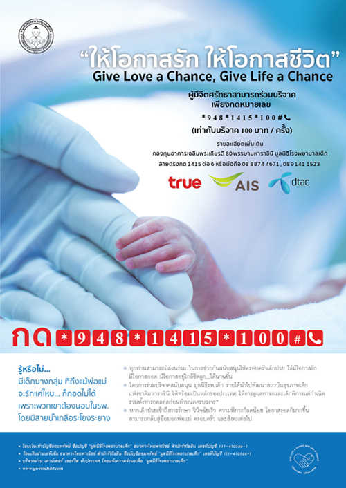“ให้โอกาสรัก ให้โอกาสชีวิต” (Give Love a Chance, Give Life a Chance) ร่วมมอบโอกาสแก่ผู้ป่วยเด็กให้คืนสู่อ้อมกอดครอบครัว กับ กองทุนอาคารเฉลิมพระเกียรติ 80 พรรษามหาราชินี เพื่อพัฒนาสถาบันฯ ให้พร้อมเป็นหลักของประเทศในการดูแลทารกและเด็กพิการแต่กำเนิดรวมทั้งทารกคลอดก่อนกำหนด ครบวงจร